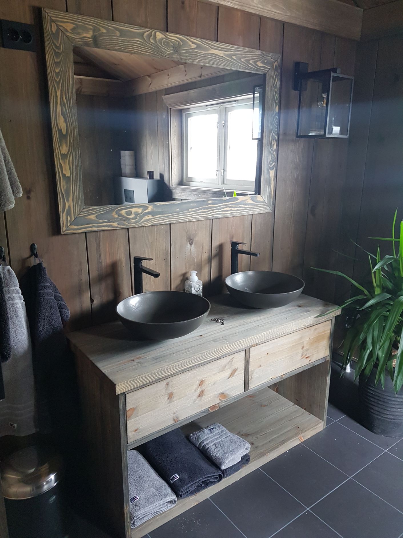Servantskap i drivved. Servantskap laget til hytte. Skapene er laget i heltre furu, stålbørstet og oljet i drivved-look med bøtteservanter.