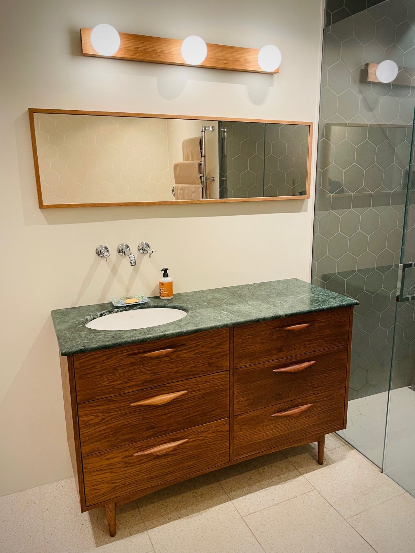 Baderomsinnredning laget i finert eik lakkert i retro stil med heltre eikeskuffer, sinket hjørnesammenføyninger etter gamle håndtverkstradisjoner. Kunde har selv skaffet granittplatetopp.