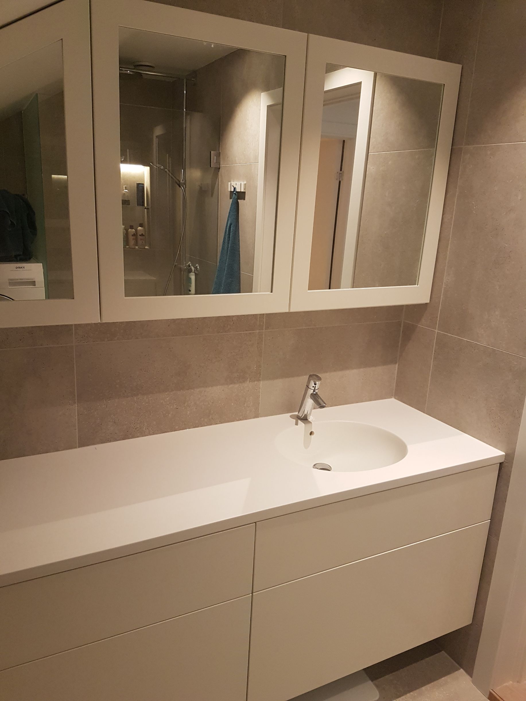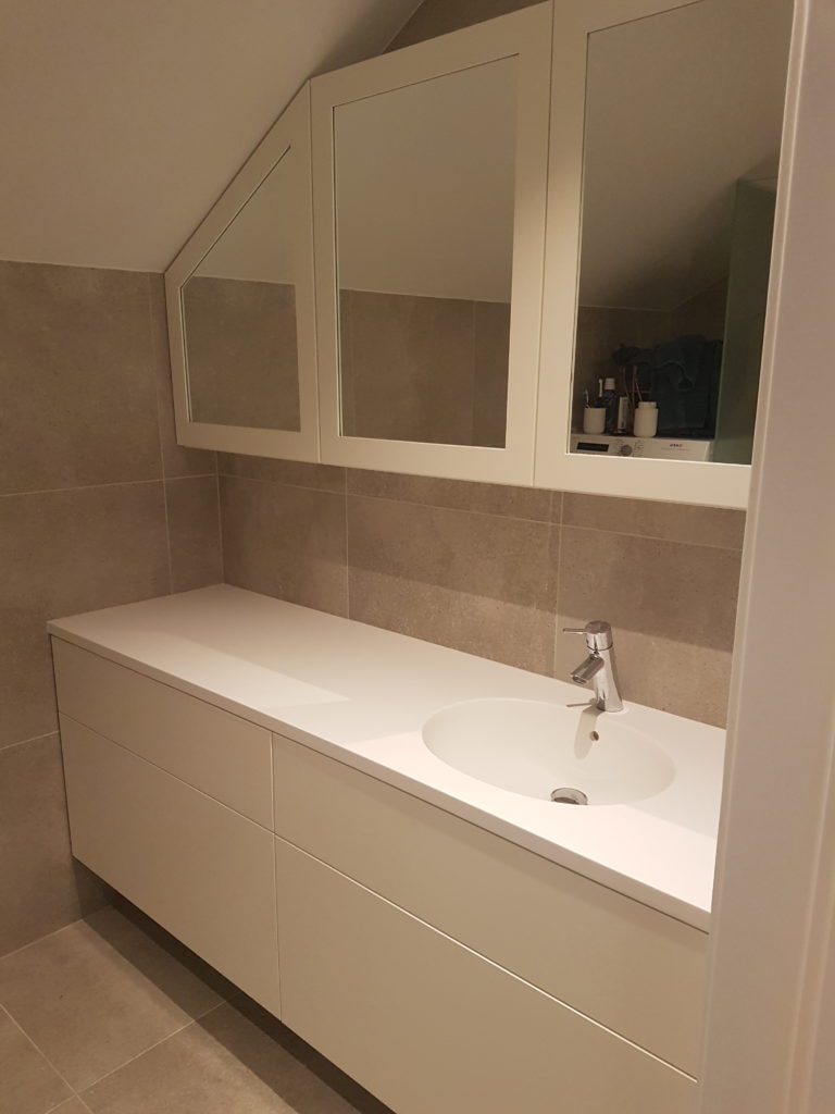 Hvitmalt baderomsinnredning skreddersydd til skråtak med speildører m/ramme. Innredningen er med servantplate i Corian med Corian kulp.